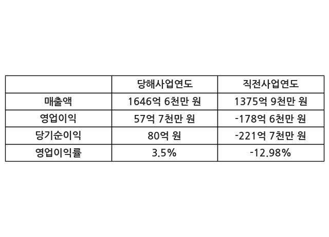 이번사업연도의 매출액은 직전사업연도 대비 19.68% 증가한 1646억 6천만 원, 영업이익은 57억 7천만 원, 당기순이익은 80억 원이라고 공시했다.
