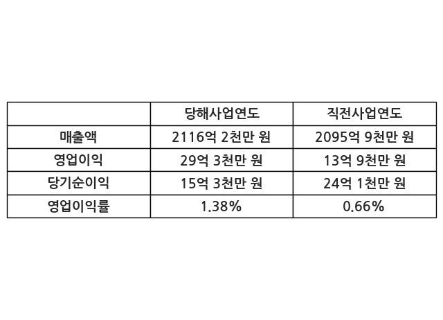 이번사업연도의 매출액은 직전사업연도 대비 0.97% 증가한 2116억 2천만 원, 영업이익은 29억 3천만 원, 당기순이익은 15억 3천만 원이라고 공시했다.
