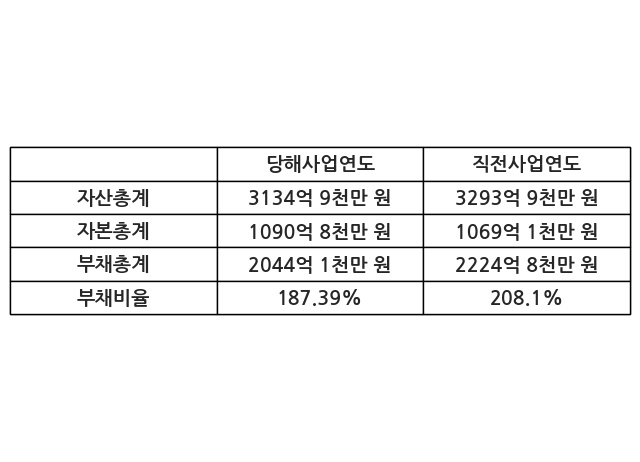또한, 이번사업연도의 자산총계는 3134억 9천만 원으로 직전사업연도 대비 -4.83% 감소한 한편, 부채총계는 2044억 1천만 원으로 -8.12% 감소, 자본총계는 1090억 8천만 원으로 2.03% 증가했다.