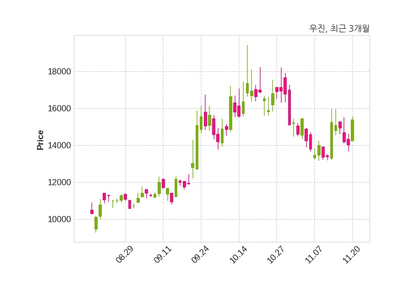 한편, 우진의 10시 11분 현재주가는 15,390원으로 직전 거래일 대비 1,350원(+9.62%) 상승이며, 거래량은 779,539주이다.