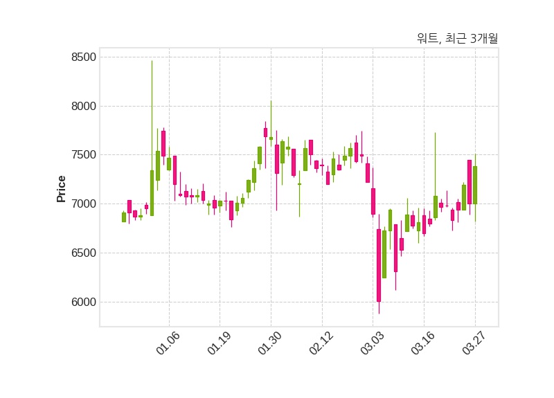 한편, 워트의 11시 19분 현재주가는 7,380원으로 직전 거래일 대비 380원(+5.43%) 상승이며, 거래량은 174,094주이다.