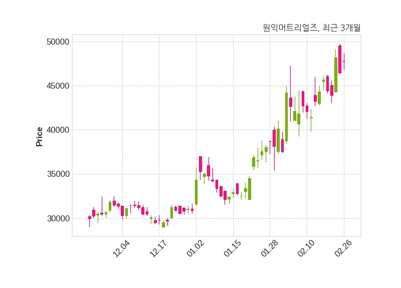 한편, 원익머트리얼즈의 15시 25분 현재주가는 47,800원으로 직전 거래일 대비 1,300원(+2.8%) 상승이며, 거래량은 74,211주이다.