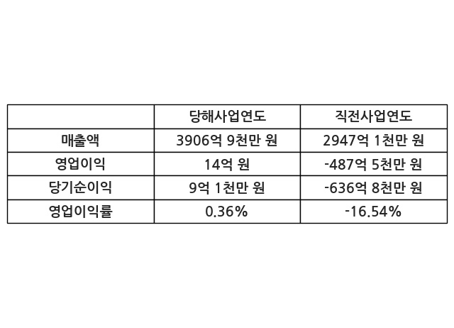 이번사업연도의 매출액은 직전사업연도 대비 32.57% 증가한 3906억 9천만 원, 영업이익은 14억 원, 당기순이익은 9억 1천만 원이라고 공시했다.