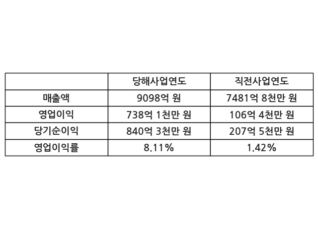 이번사업연도의 매출액은 직전사업연도 대비 21.6% 증가한 9098억 원, 영업이익은 738억 1천만 원, 당기순이익은 840억 3천만 원이라고 공시했다.