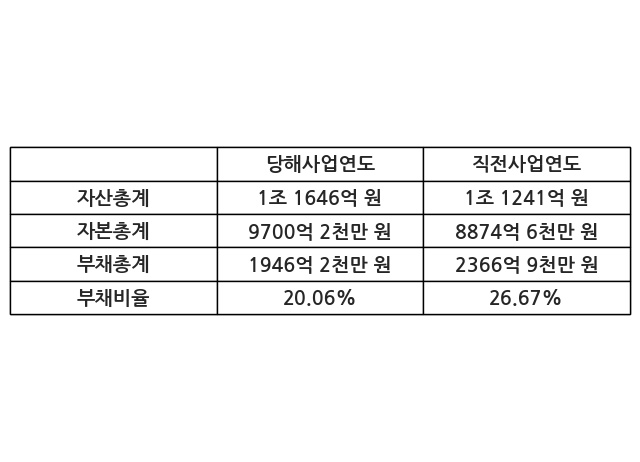 또한, 이번사업연도의 자산총계는 1조 1646억 원으로 직전사업연도 대비 3.6% 증가한 한편, 부채총계는 1946억 2천만 원으로 -17.77% 감소, 자본총계는 9700억 2천만 원으로 9.3% 증가했다.