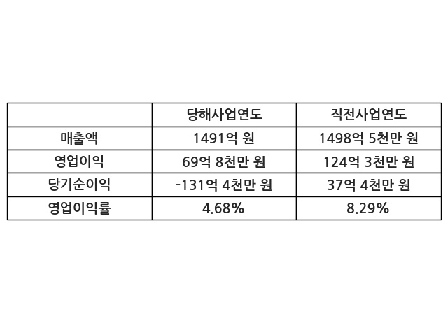 이번사업연도의 매출액은 직전사업연도 대비 -0.5% 감소한 1491억 원, 영업이익은 69억 8천만 원, 당기순이익은 -131억 4천만 원이라고 공시했다.