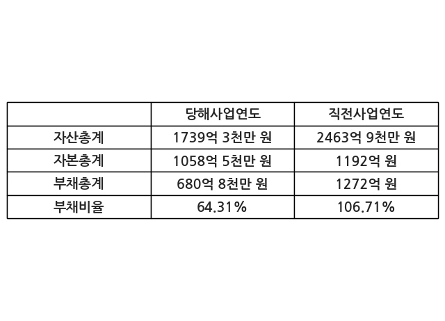또한, 이번사업연도의 자산총계는 1739억 3천만 원으로 직전사업연도 대비 -29.41% 감소한 한편, 부채총계는 680억 8천만 원으로 -46.48% 감소, 자본총계는 1058억 5천만 원으로 -11.19% 감소했다.