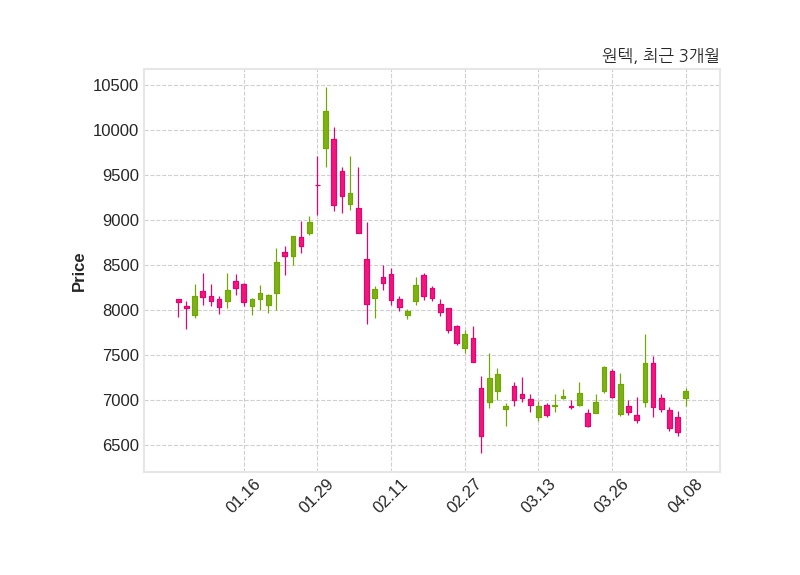 한편, 원텍의 15시 21분 현재주가는 7,100원으로 직전 거래일 대비 450원(+6.77%) 상승이며, 거래량은 604,360주이다.
