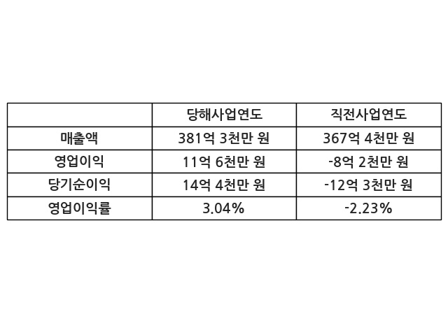 이번사업연도의 매출액은 직전사업연도 대비 3.78% 증가한 381억 3천만 원, 영업이익은 11억 6천만 원, 당기순이익은 14억 4천만 원이라고 공시했다.