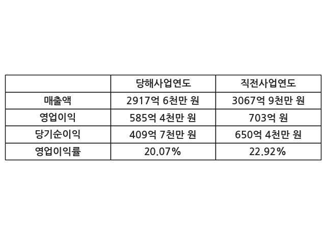 이번사업연도의 매출액은 직전사업연도 대비 -4.9% 감소한 2917억 6천만 원, 영업이익은 585억 4천만 원, 당기순이익은 409억 7천만 원이라고 공시했다.