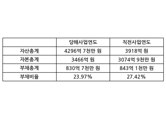 또한, 이번사업연도의 자산총계는 4296억 7천만 원으로 직전사업연도 대비 9.67% 증가한 한편, 부채총계는 830억 7천만 원으로 -1.47% 감소, 자본총계는 3466억 원으로 12.72% 증가했다.