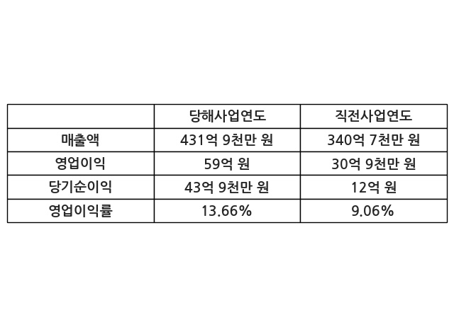 이번사업연도의 매출액은 직전사업연도 대비 26.77% 증가한 431억 9천만 원, 영업이익은 59억 원, 당기순이익은 43억 9천만 원이라고 공시했다.