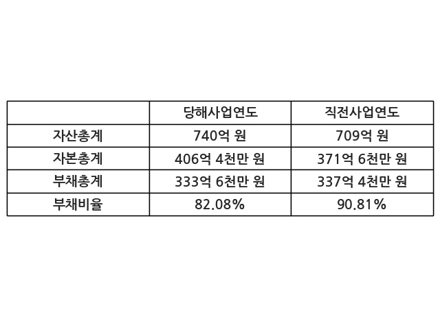 또한, 이번사업연도의 자산총계는 740억 원으로 직전사업연도 대비 4.37% 증가한 한편, 부채총계는 333억 6천만 원으로 -1.14% 감소, 자본총계는 406억 4천만 원으로 9.38% 증가했다.