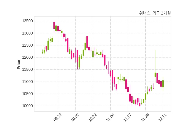 한편, 위너스의 14시 22분 현재주가는 11,040원으로 직전 거래일 대비 240원(+2.22%) 상승이며, 거래량은 6,573주이다.