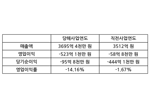 이번사업연도의 매출액은 직전사업연도 대비 5.22% 증가한 3695억 4천만 원, 영업이익은 -523억 1천만 원, 당기순이익은 -95억 8천만 원이라고 공시했다.