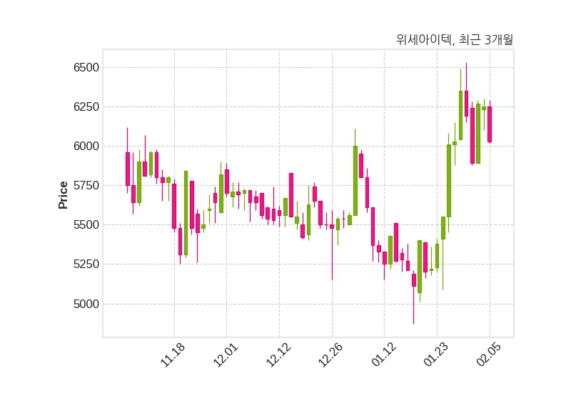한편, 위세아이텍은 장 마감 이후 해당 기업공시를 발표했으며 오늘 종가가 6,030원, 거래량은 52,771주로, 직전 거래일 대비 220원(-3.52%) 하락했다.