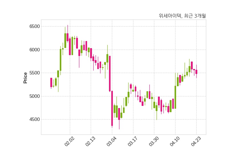 한편, 위세아이텍은 장 마감 이후 해당 기업공시를 발표했으며 오늘 종가가 5,480원, 거래량은 23,264주로, 직전 거래일 대비 80원(-1.44%) 하락했다.