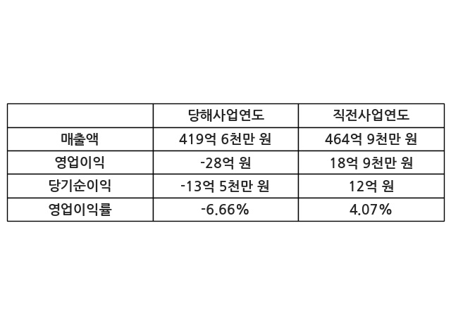 이번사업연도의 매출액은 직전사업연도 대비 -9.76% 감소한 419억 6천만 원, 영업이익은 -28억 원, 당기순이익은 -13억 5천만 원이라고 공시했다.