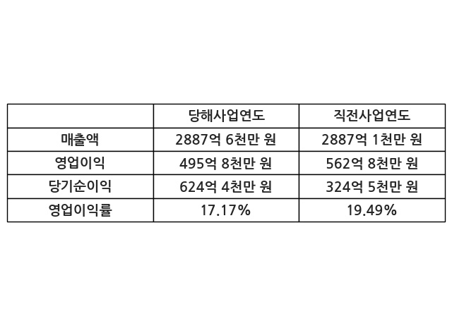 이번사업연도의 매출액은 직전사업연도 대비 0.02% 증가한 2887억 6천만 원, 영업이익은 495억 8천만 원, 당기순이익은 624억 4천만 원이라고 공시했다.