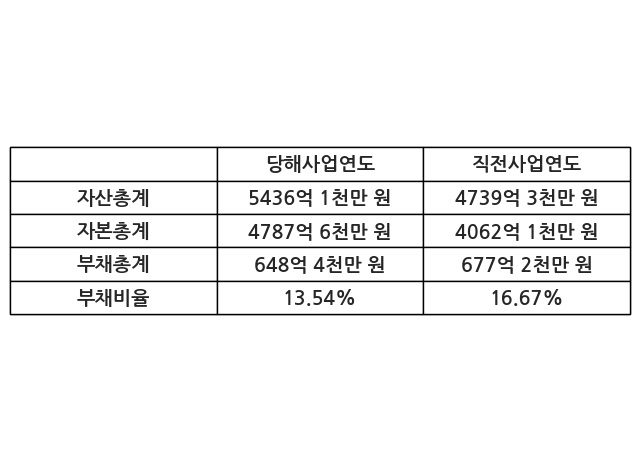 또한, 이번사업연도의 자산총계는 5436억 1천만 원으로 직전사업연도 대비 14.7% 증가한 한편, 부채총계는 648억 4천만 원으로 -4.25% 감소, 자본총계는 4787억 6천만 원으로 17.86% 증가했다.