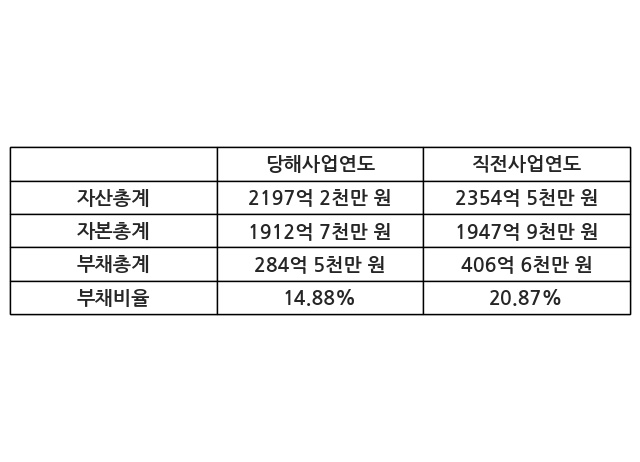 또한, 이번사업연도의 자산총계는 2197억 2천만 원으로 직전사업연도 대비 -6.68% 감소한 한편, 부채총계는 284억 5천만 원으로 -30.02% 감소, 자본총계는 1912억 7천만 원으로 -1.81% 감소했다.