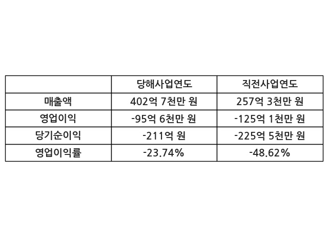이번사업연도의 매출액은 직전사업연도 대비 56.48% 증가한 402억 7천만 원, 영업이익은 -95억 6천만 원, 당기순이익은 -211억 원이라고 공시했다.