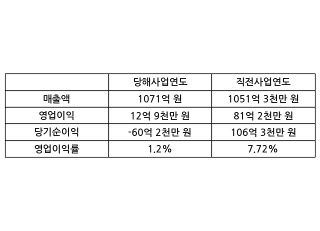 이번사업연도의 매출액은 직전사업연도 대비 1.87% 증가한 1071억 원, 영업이익은 12억 9천만 원, 당기순이익은 -60억 2천만 원이라고 공시했다.