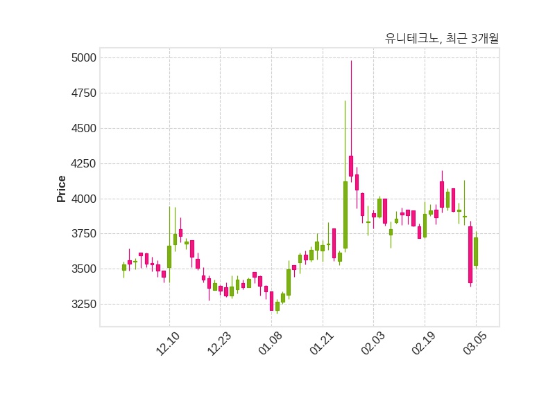 한편, 유니테크노의 13시 35분 현재주가는 3,720원으로 직전 거래일 대비 320원(+9.41%) 상승이며, 거래량은 222,831주이다.