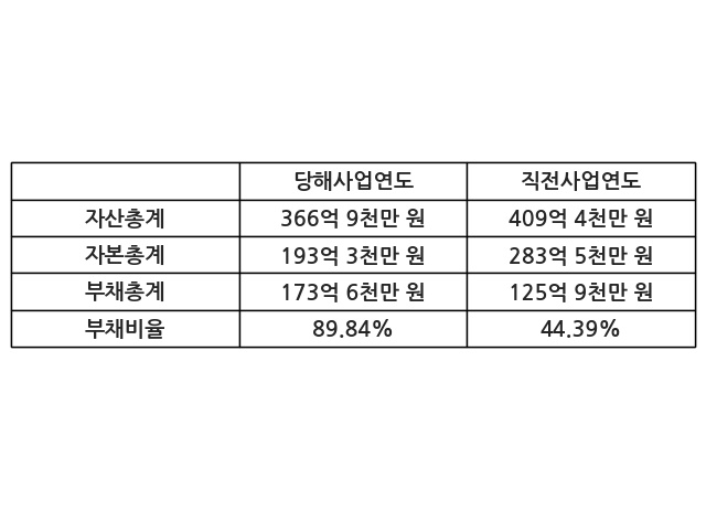 또한, 이번사업연도의 자산총계는 366억 9천만 원으로 직전사업연도 대비 -10.38% 감소한 한편, 부채총계는 173억 6천만 원으로 37.94% 증가, 자본총계는 193억 3천만 원으로 -31.84% 감소했다.