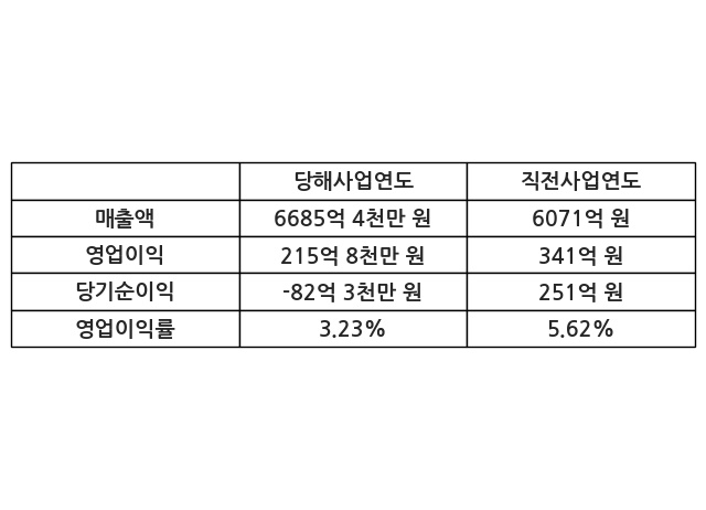 이번사업연도의 매출액은 직전사업연도 대비 10.12% 증가한 6685억 4천만 원, 영업이익은 215억 8천만 원, 당기순이익은 -82억 3천만 원이라고 공시했다.