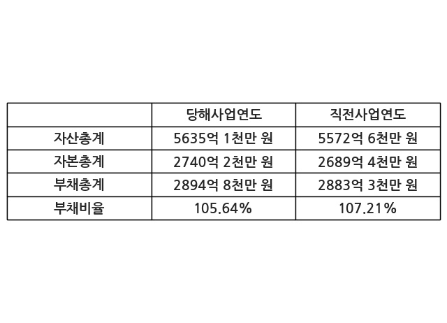 또한, 이번사업연도의 자산총계는 5635억 1천만 원으로 직전사업연도 대비 1.12% 증가한 한편, 부채총계는 2894억 8천만 원으로 0.4% 증가, 자본총계는 2740억 2천만 원으로 1.89% 증가했다.