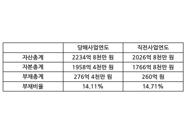 또한, 이번사업연도의 자산총계는 2234억 8천만 원으로 직전사업연도 대비 10.26% 증가한 한편, 부채총계는 276억 4천만 원으로 6.32% 증가, 자본총계는 1958억 4천만 원으로 10.84% 증가했다.