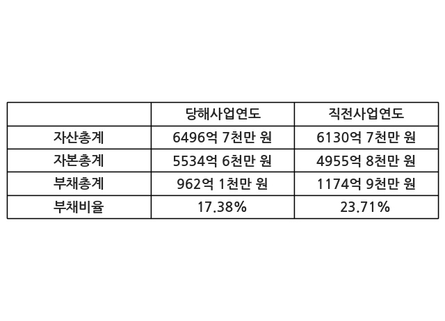 또한, 이번사업연도의 자산총계는 6496억 7천만 원으로 직전사업연도 대비 5.97% 증가한 한편, 부채총계는 962억 1천만 원으로 -18.11% 감소, 자본총계는 5534억 6천만 원으로 11.68% 증가했다.