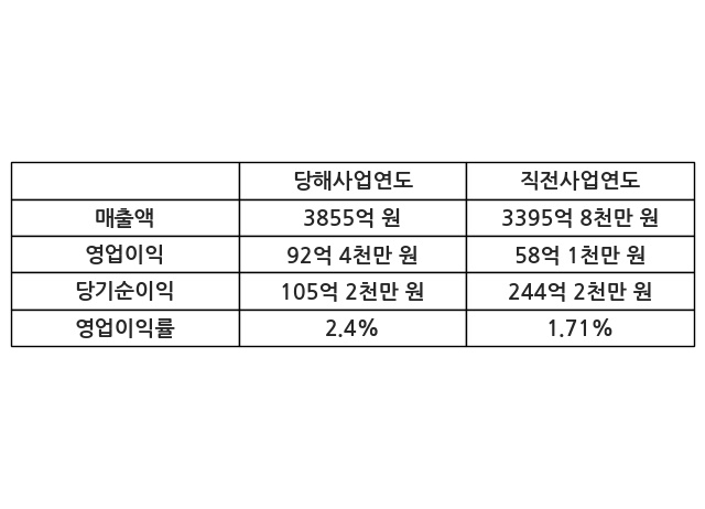 이번사업연도의 매출액은 직전사업연도 대비 13.52% 증가한 3855억 원, 영업이익은 92억 4천만 원, 당기순이익은 105억 2천만 원이라고 공시했다.