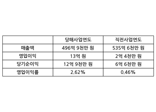 이번사업연도의 매출액은 직전사업연도 대비 -7.22% 감소한 496억 9천만 원, 영업이익은 13억 원, 당기순이익은 12억 9천만 원이라고 공시했다.