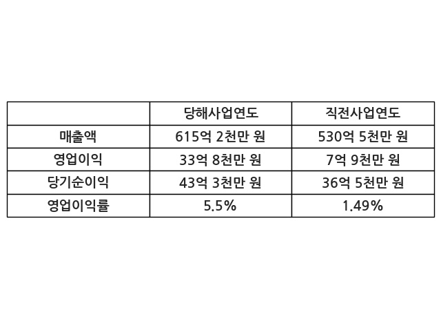 이번사업연도의 매출액은 직전사업연도 대비 15.98% 증가한 615억 2천만 원, 영업이익은 33억 8천만 원, 당기순이익은 43억 3천만 원이라고 공시했다.