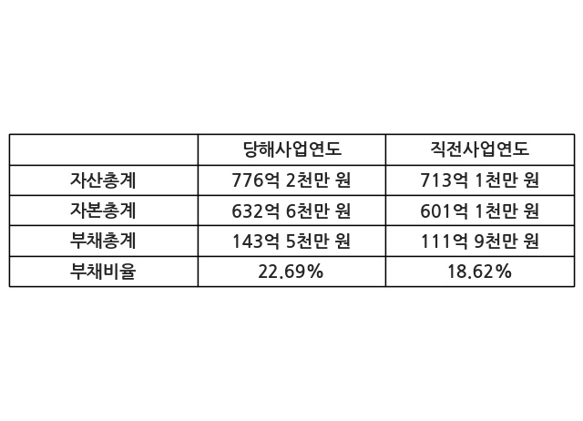 또한, 이번사업연도의 자산총계는 776억 2천만 원으로 직전사업연도 대비 8.85% 증가한 한편, 부채총계는 143억 5천만 원으로 28.24% 증가, 자본총계는 632억 6천만 원으로 5.24% 증가했다.
