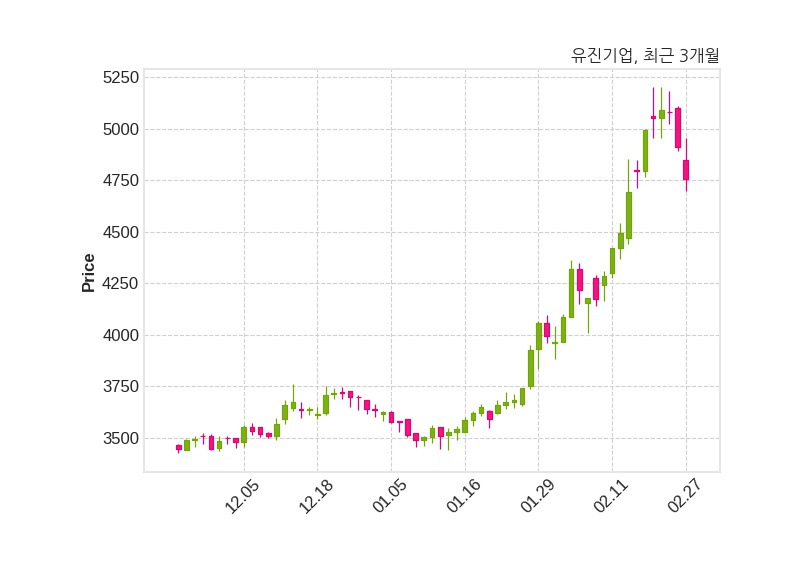 한편, 유진기업은 장 마감 이후 해당 기업공시를 발표했으며 오늘 종가가 4,755원, 거래량은 548,913주로, 직전 거래일 대비 155원(-3.16%) 하락했다.