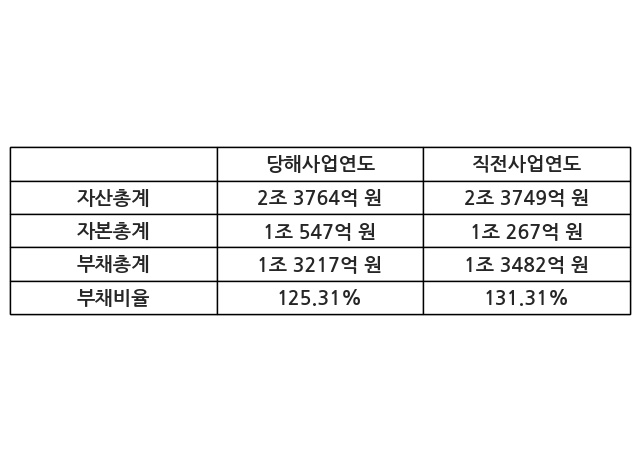 또한, 이번사업연도의 자산총계는 2조 3764억 원으로 직전사업연도 대비 0.07% 증가한 한편, 부채총계는 1조 3217억 원으로 -1.96% 감소, 자본총계는 1조 547억 원으로 2.73% 증가했다.