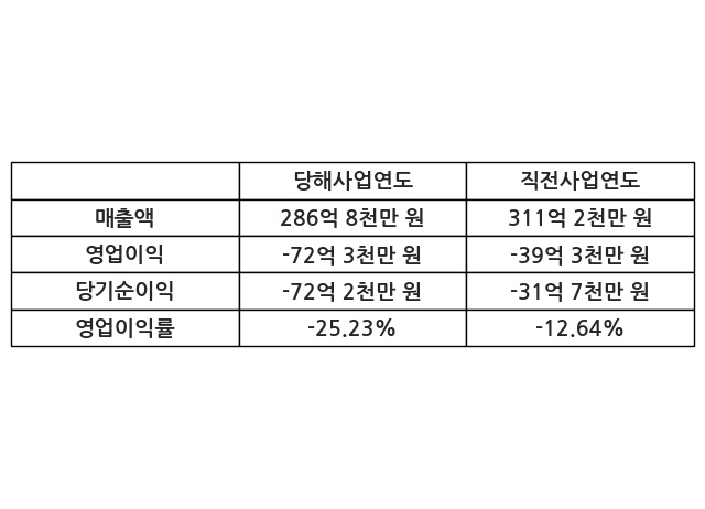 이번사업연도의 매출액은 직전사업연도 대비 -7.85% 감소한 286억 8천만 원, 영업이익은 -72억 3천만 원, 당기순이익은 -72억 2천만 원이라고 공시했다.