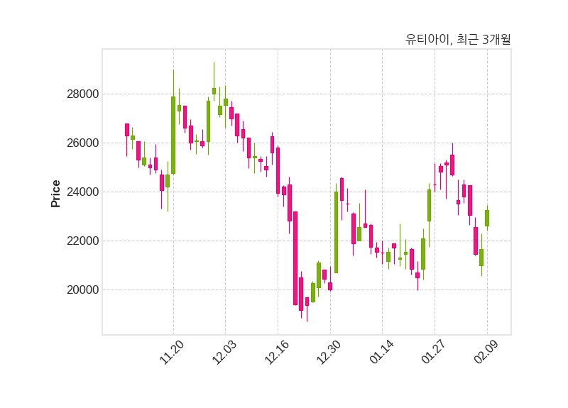 한편, 유티아이는 장 마감 이후 해당 기업공시를 발표했으며 오늘 종가가 23,250원, 거래량은 88,614주로, 직전 거래일 대비 1,600원(+7.39%) 상승했다.