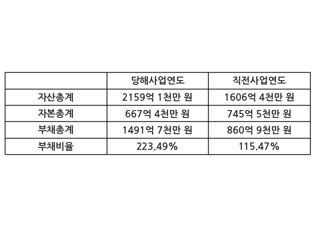 또한, 이번사업연도의 자산총계는 2159억 1천만 원으로 직전사업연도 대비 34.41% 증가한 한편, 부채총계는 1491억 7천만 원으로 73.27% 증가, 자본총계는 667억 4천만 원으로 -10.48% 감소했다.