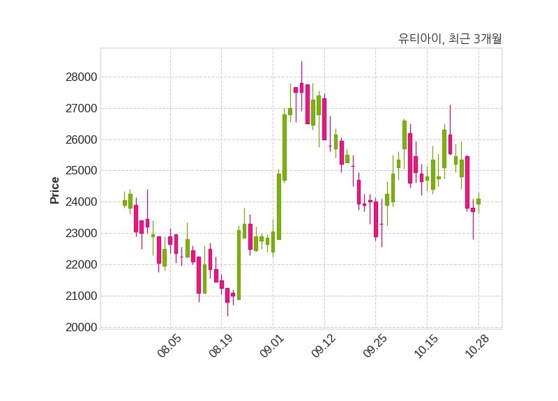 한편, 유티아이는 장 마감 이후 해당 기업공시를 발표했으며 오늘 종가가 24,100원, 거래량은 33,145주로, 직전 거래일 대비 400원(+1.69%) 상승했다.