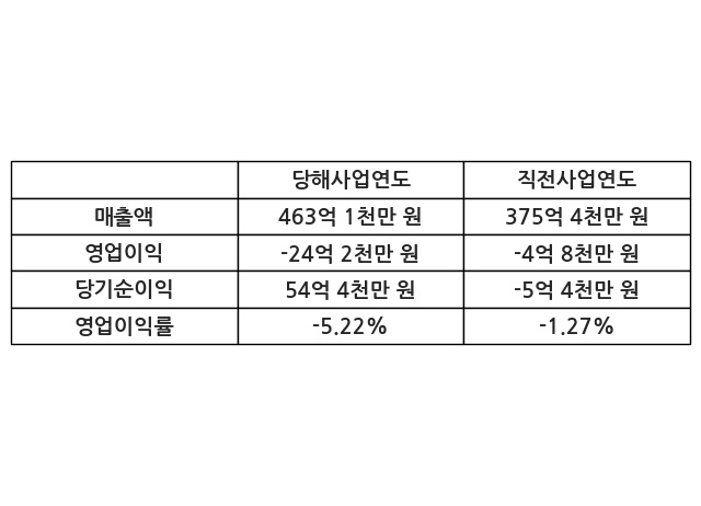 이번사업연도의 매출액은 직전사업연도 대비 23.36% 증가한 463억 1천만 원, 영업이익은 -24억 2천만 원, 당기순이익은 54억 4천만 원이라고 공시했다.