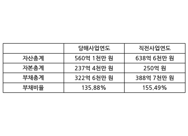 또한, 이번사업연도의 자산총계는 560억 1천만 원으로 직전사업연도 대비 -12.3% 감소한 한편, 부채총계는 322억 6천만 원으로 -16.99% 감소, 자본총계는 237억 4천만 원으로 -5.01% 감소했다.