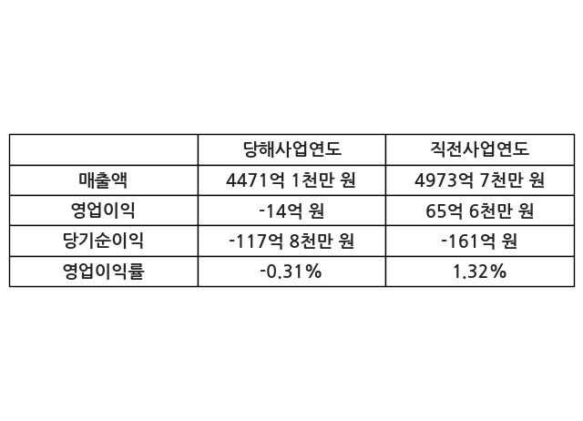 이번사업연도의 매출액은 직전사업연도 대비 -10.1% 감소한 4471억 1천만 원, 영업이익은 -14억 원, 당기순이익은 -117억 8천만 원이라고 공시했다.