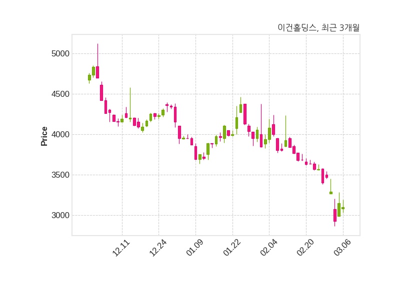 한편, 이건홀딩스의 13시 38분 현재주가는 3,095원으로 직전 거래일 대비 50원(-1.59%) 하락이며, 거래량은 82,787주이다.