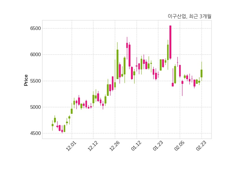 한편, 이구산업의 13시 20분 현재주가는 5,710원으로 직전 거래일 대비 210원(+3.82%) 상승이며, 거래량은 973,167주이다.