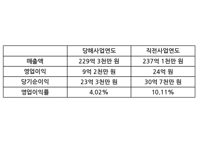 이번사업연도의 매출액은 직전사업연도 대비 -3.26% 감소한 229억 3천만 원, 영업이익은 9억 2천만 원, 당기순이익은 23억 3천만 원이라고 공시했다.