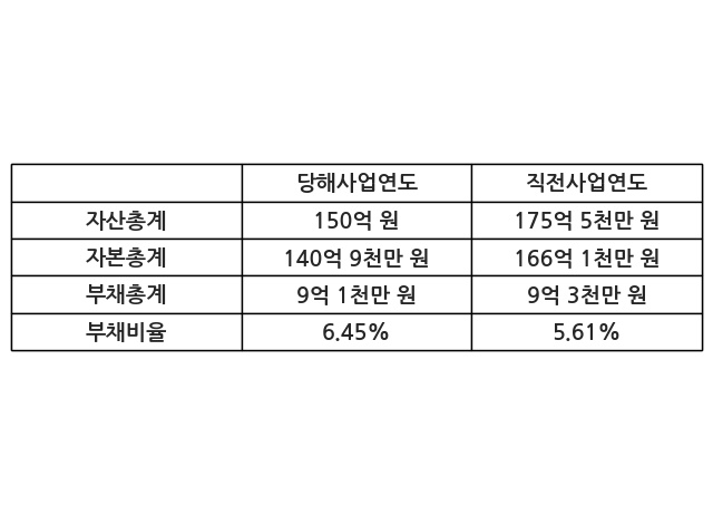 또한, 이번사업연도의 자산총계는 150억 원으로 직전사업연도 대비 -14.49% 감소한 한편, 부채총계는 9억 1천만 원으로 -2.59% 감소, 자본총계는 140억 9천만 원으로 -15.16% 감소했다.